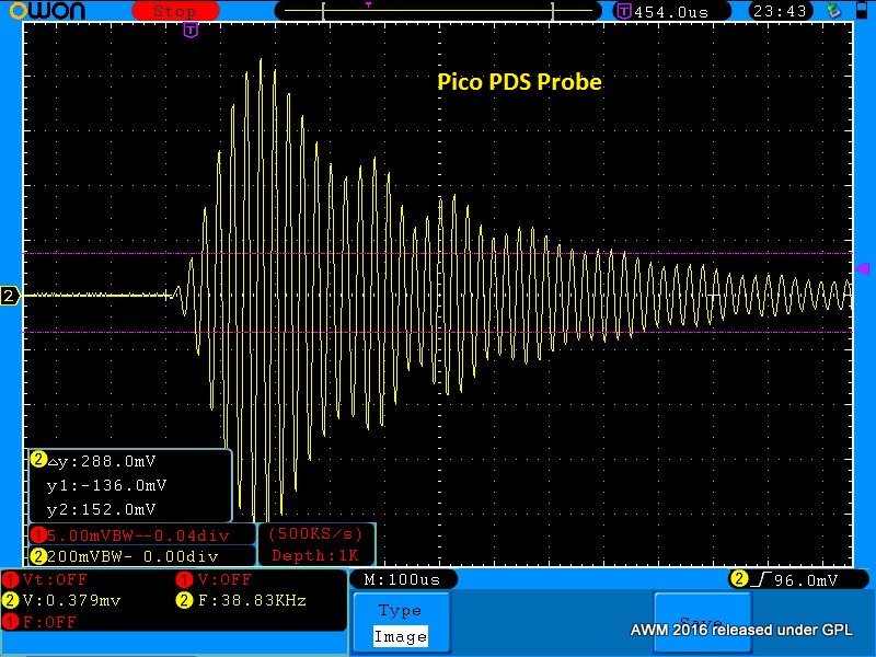 (3) The home build probe also works and produces a higher voltage amplitude signal than the Pico PDS probe.