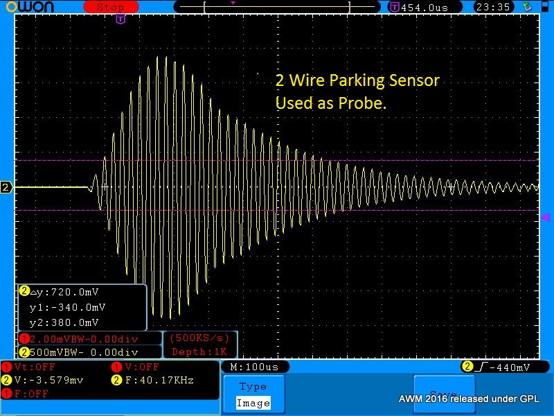 The trace below is from a home build probe which was simply a 2 wire aftermarket parking distance sensor.
