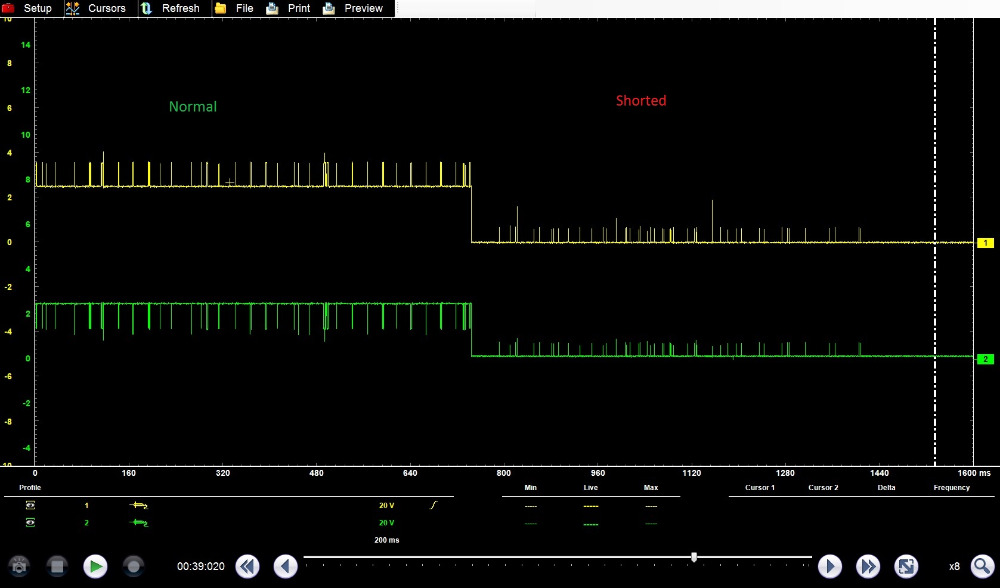 You can tell that the network nodes are still trying to create signals in both cases, but the test light definitely pulls the voltage high and low. Both result in a no crank and no communication with anything, but goes back to normal after disconnecting the test light. U0100 sets in every module afterwards. No magic smoke yet!