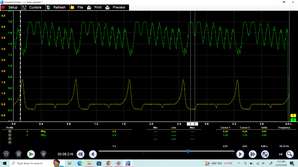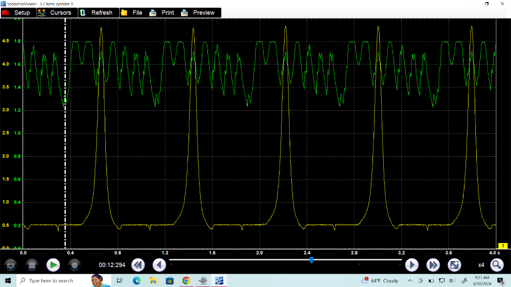 Also pretty new to lab scopes in general, im spending some time with in cylinder pressure waveforms and relative compression tests, collecting good and bad waveforms. A customer brought in a 2008 Chrysler 300 5.7 with a hole in the piston on cylinder 1, thought it would be a great capture.