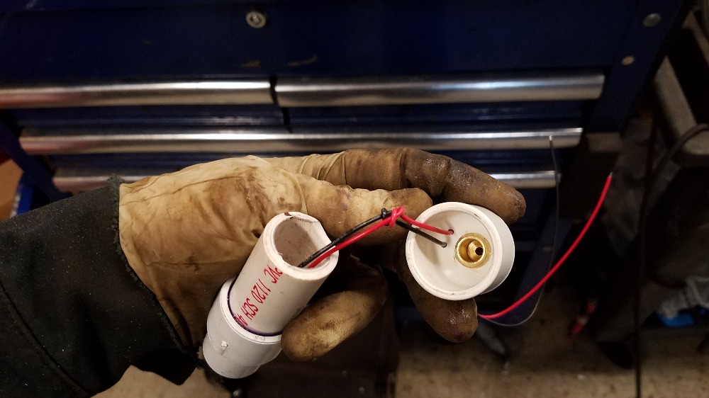 The disc sits between the end of the 3/4" pipe and the rubber washer. The notch is for the wire soldered to the disc.