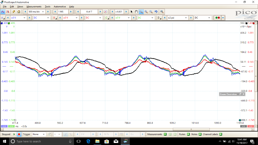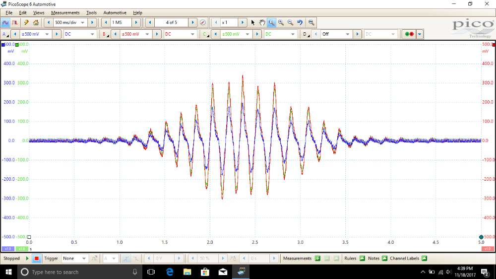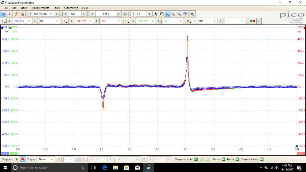 Sorry for the lack of info. :blush: It's intake vacuum pressure pulses during cranking, using the piezo disc inside the plumbing fittings. The scope trace can definitely be inverted depending on personal preference. I've just come to think of vacuum pulses as 'good', and lack of pulses or pressure as bad. As far as these waveforms go, anyway.