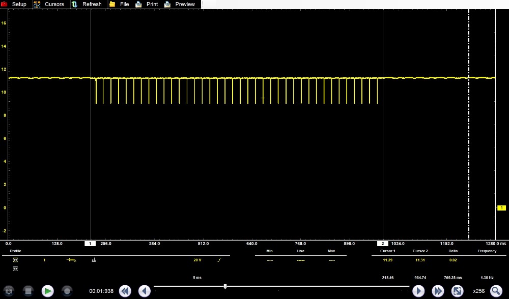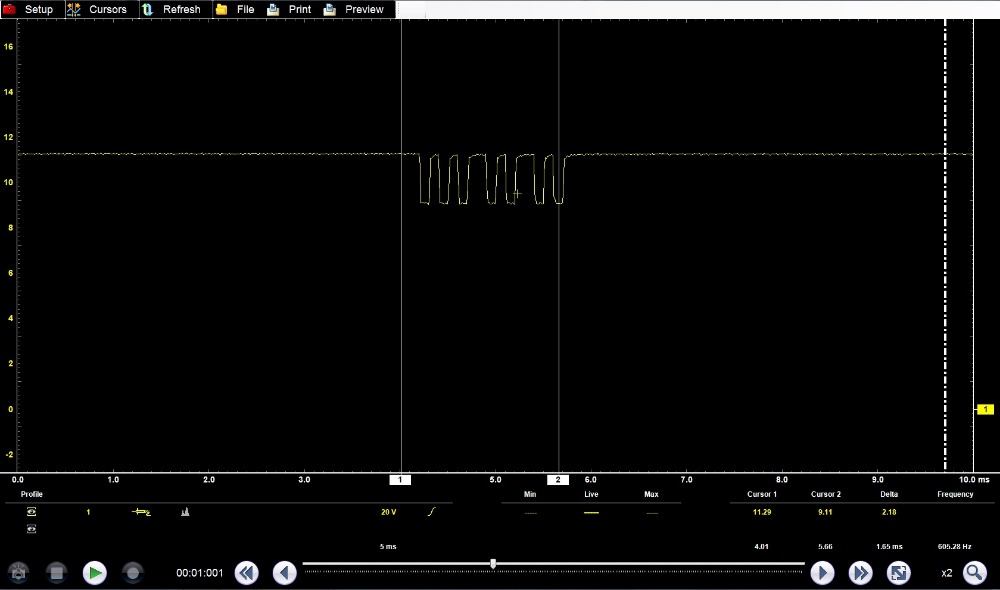 I didn't know what to expect, but it sure wasn't this. :lol: The unlock button generates a very similar signal, only small-big-small-small-big-small. Unplugged, the signal stays at a steady 12ish volts.