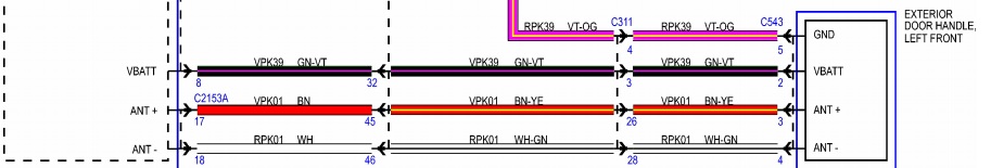 The drivers side lock and unlock didn't work, which is what happens when someone leave the door handle connector unplugged the last time they had the door panel off. :lol: But I'm there now, so I decide to get some known good data anyway. Here's the snippet of the Ford wiring diagram for reference: