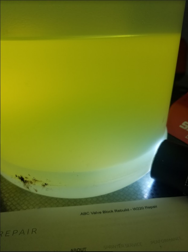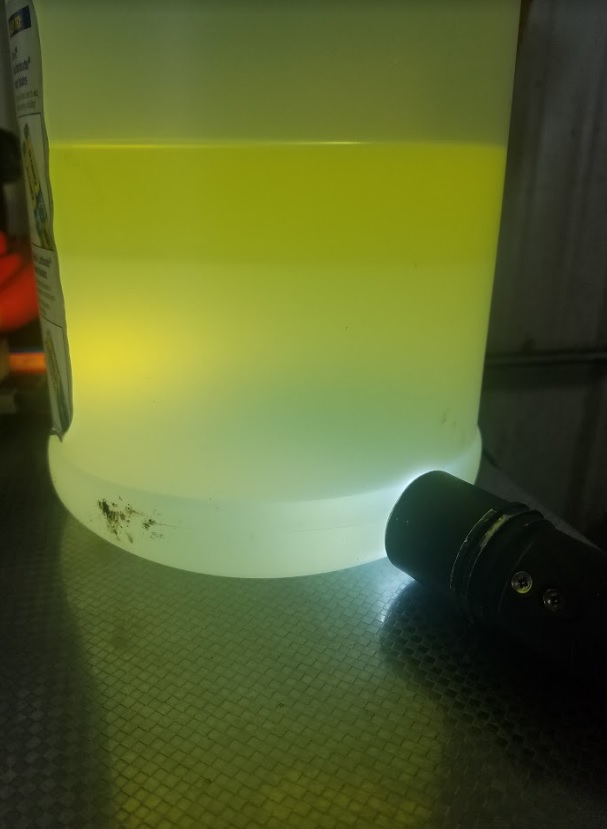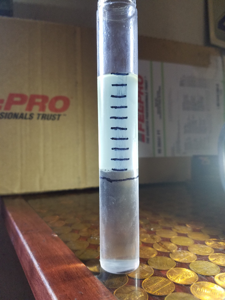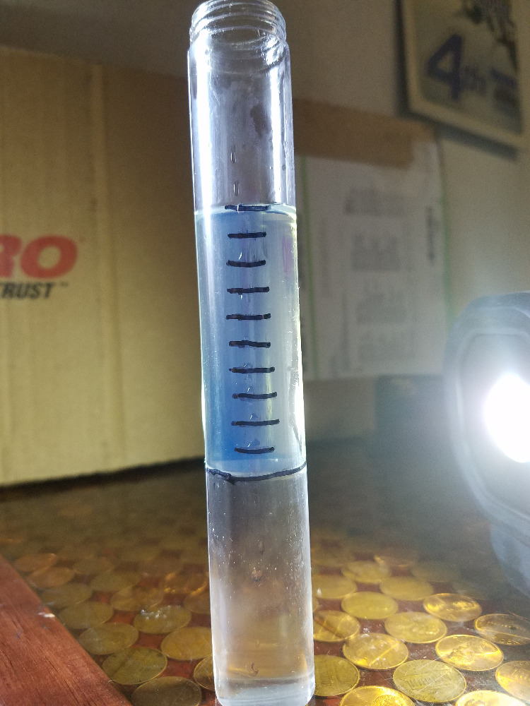 But you probably don't, so you'll need another method to test for ethanol content. The basic idea is this: Take a fuel sample, put a known quantity in a clear container, and add a known quantity of water to the fuel. Skake it up and watch where the separation happens. The water will absorb the ethanol in the fuel, and thus sink to the bottom along with the water. For this example, I added nine parts gas and one part water to a gallon jug. This is a known good sample from my car: