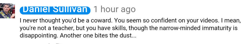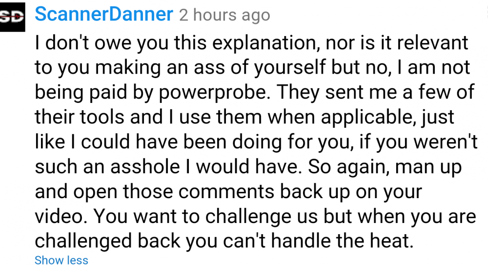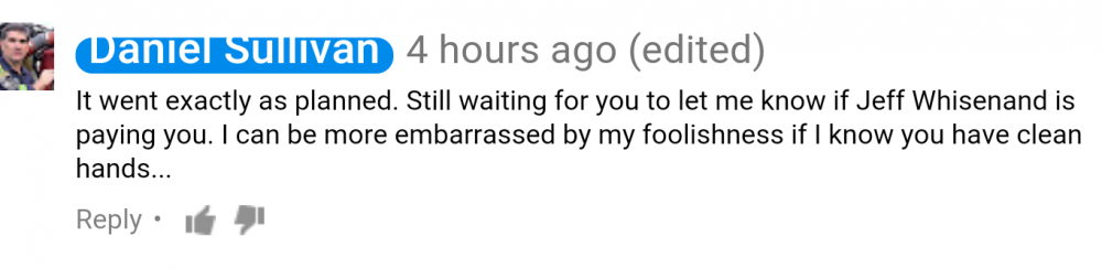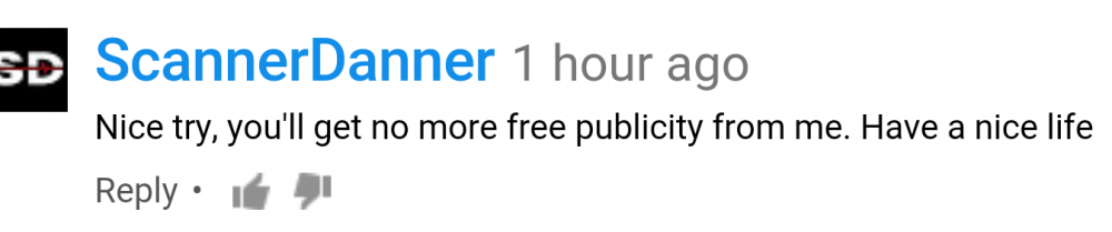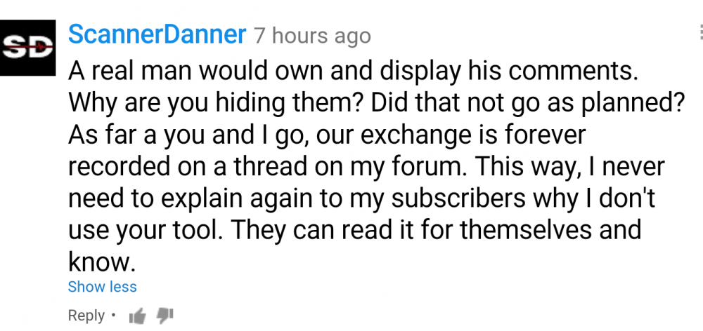 ScannerDanner wrote: I called it. He deleted the video. What a cowardly thing to do. At least I have the exchange between us recorded here. It's a shame, we've all learned so much about how he operates in the comments section of that video. I should have recorded more of it.