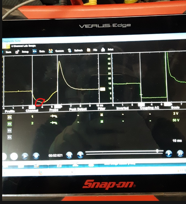 Yes, that's a home made secondary ignition probe touching a fuel injector in yellow with the control voltage displayed in green.