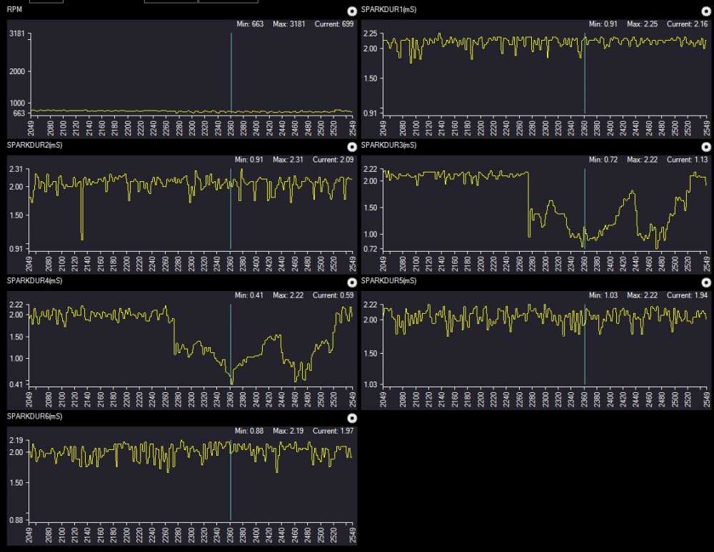 FYI, many new Fords are also providing spark duration data on the scan tool. It's not as good as having an actual secondary pattern, but it's very useful for diagnostic direction. Here's an example I got off an '06 Mountaineer with a 4.0L. I pulled the #4 wire off the coil at around frame 2280, and was manipulating the spark with a test light.