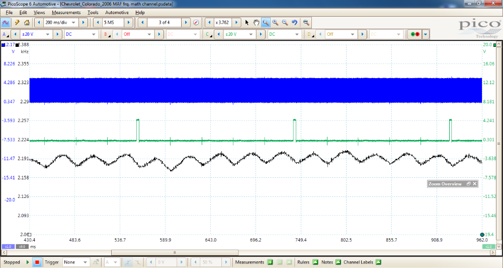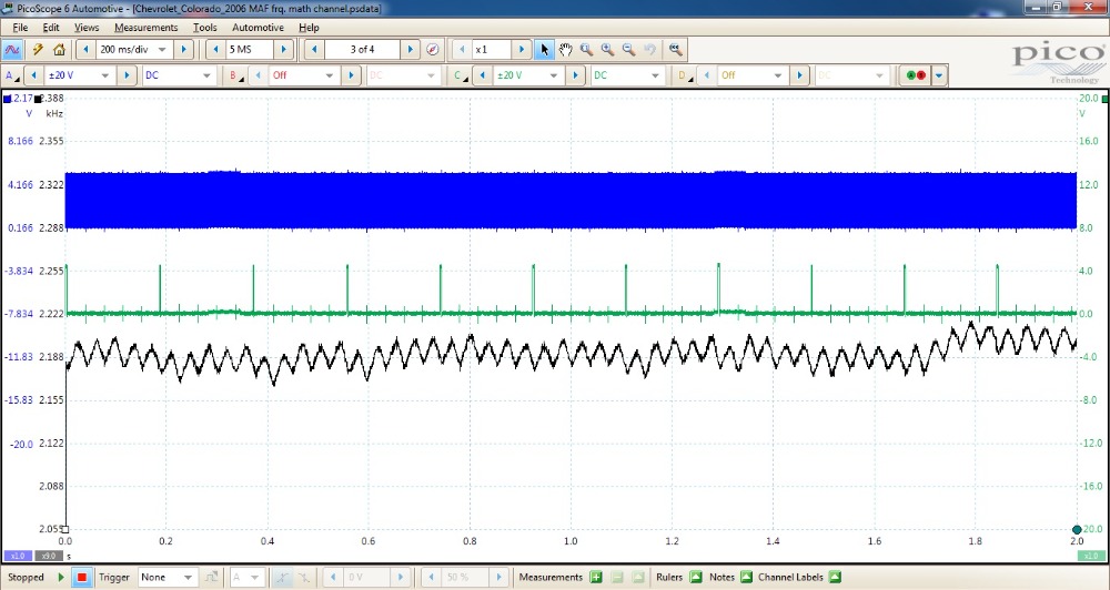 The other day I mentioned to use a math channel to visualize the intake pulls on a digital MAF sensor voltage signal. You would apply a frequency math channel and obtain a trace showing the subtle nuances for every single cylinder. I believe this is basically what the guided test for a digital MAF sensor does.... but with a math channel you would be able to safe one real channel and condition the signal in the way it fits best your purpose.