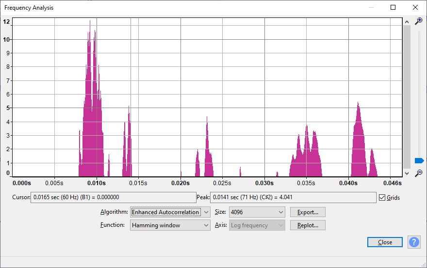 Chad, I played around with the audio recordings I made. A low pass filter of 300hz was applied and then I tried to use the same sort of FFT configuration you describe in your video. I'm using Audactiy so the plot is a bit different than yours with the lower frequencies on the left. You can see the knocking sound dominates the before (B4) sample between 0.000s and 0.005s. Since I was not using a contact pickup like you there is more noise as well.
