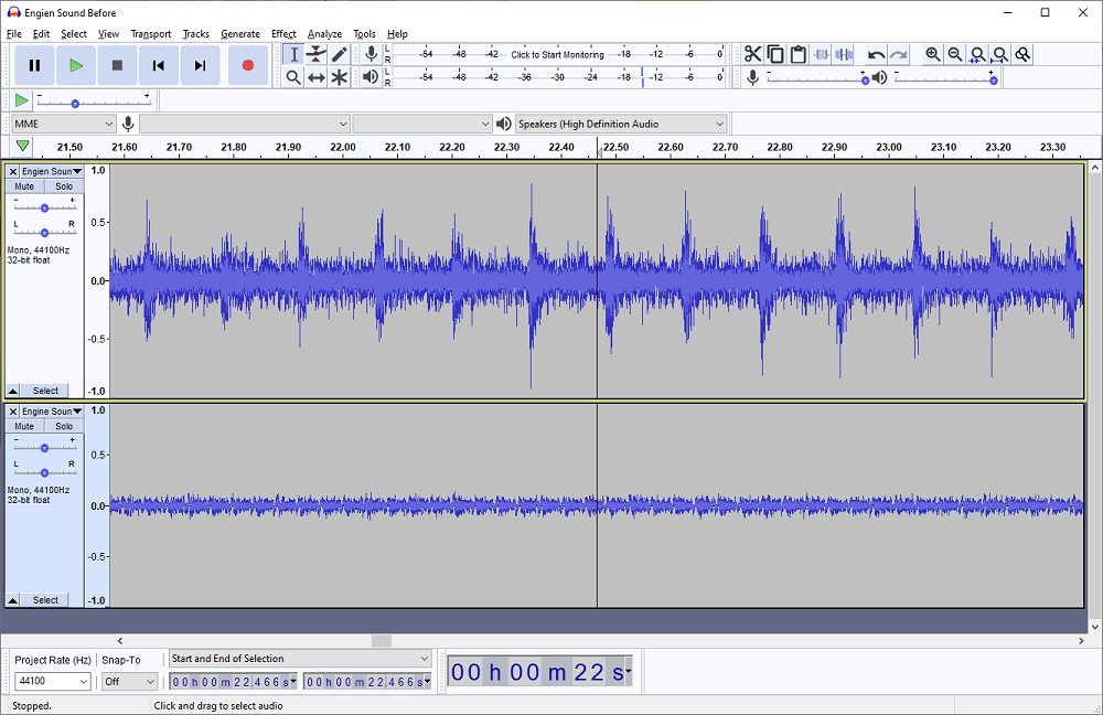 I decided to take a video as I had not come across a good before/after recording of this clatter noise. When editing the video I was surprised that even the crude audio level chart of the video editing software clearly showed the difference between the two sounds samples (before and after fix.) I then exported the audio and brought it into Audacity to get a better look (image attached.) The microphone was in the same place during both recordings so the audio level between the recordings is true to life (I did not normalize the samples.) Top trace is before, bottom trace is after. [If you are up for a laugh I'll post a link to the video when I'm done editing it. Just a shade tree mechanic in his driveway. ScannerDanner has nothing to worry about