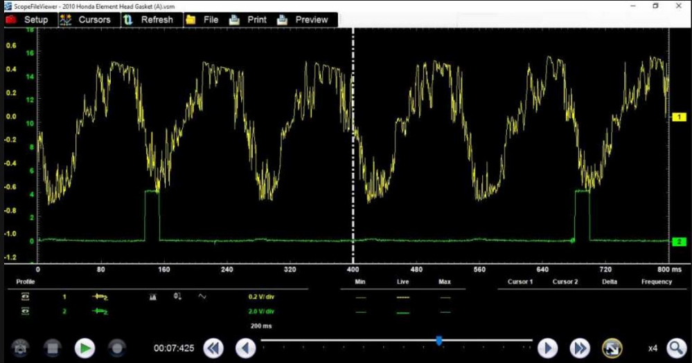 Cylinders 1 and 2 look normal. Cylinders 3 and 4, both, look like this. This car runs, albeit a bit rough. Noticeable misfire. Short term fuel trim starts counting into the negatives. -1, -2, -3....all the way to...-35, -36, -37. When it reaches -37, it resets to zero. And begins counting, again. When it resets to zero, the misfires go away. The more negative the fuel trim goes, the misfires return and the rougher it runs.