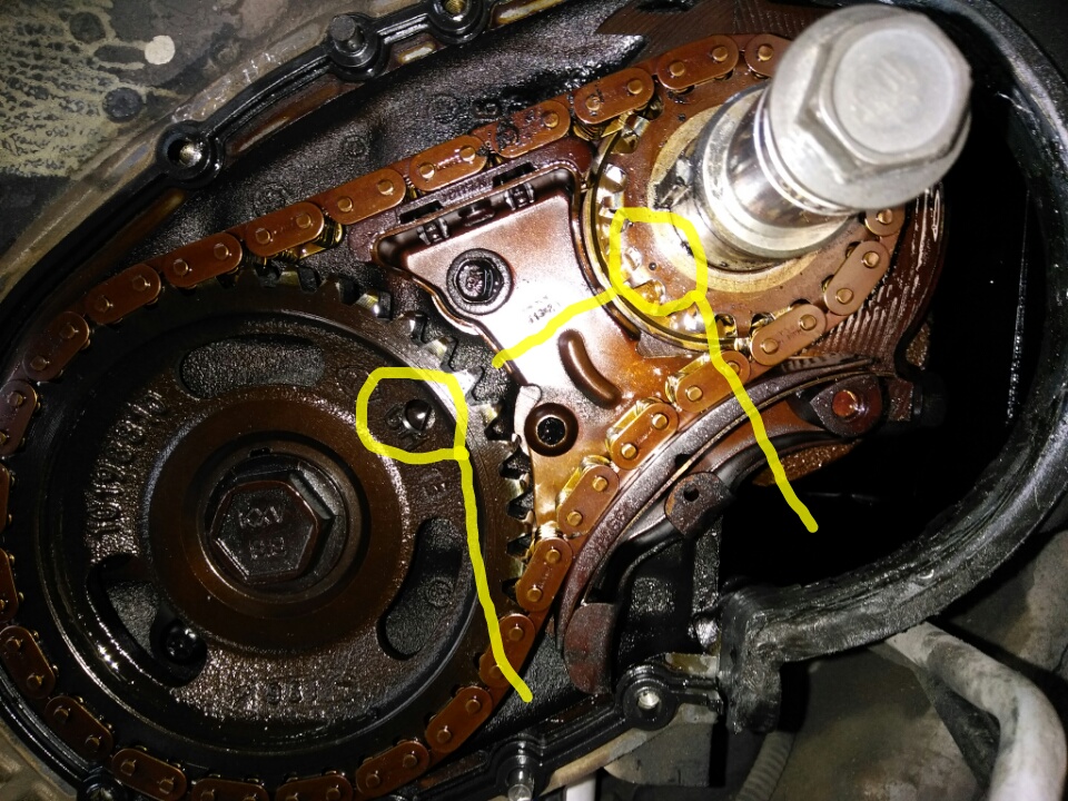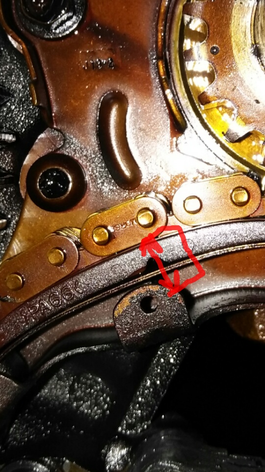 Looking at that picture of my timing chain, it seems obvious (now that I know) that my chain is stretched. But I'm wondering about whether or not it did jump teeth. My sprockets don't line up, but they are so close, if I were to somehow move one gear, just enough to adjust one tooth, it would pass the line up marks and be off on the other direction. The gap, or distance, I'm not sure how that would be measured, is less than the distance between teeth on the gears. It seems like the only way to line them up, would be to shorten the chain a tiny bit, otherwise it would move too much. For instance, if the chain jumped one tooth, and that would take the timing off by 10 degrees(random number for example), then the marks are currently only about 5 degrees off. So if I adjusted the chain one tooth, it would be either 15 degrees off of center in the clockwise direction, or 5 degrees off of center going counter clockwise. By looking at it, it appears that it's only off because the chain stretched. So, taking that into account, unless there's something I'm not understanding, or seeing, It doesn't seem like it jumped. And if it didn't jump, the pistons wouldn't hit the valves, correct? I apologise for being like "well if this, what about that", this is what I've been going through for the last several weeks. I greatly appreciate you guys taking the time to help me figure this out. It seems like everyone I know is more in to Facebook, than mechanical stuff. Hell my brother graduated from motorcycle mechanic school, and had to ask me if red is positive. So there's really nobody I can ask for help.
