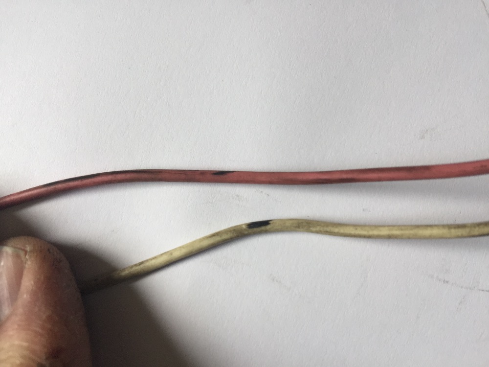 Time for me to work on this problem has been even more intermittent than the problem itself. Now that the truck has been sitting in my driveway for a month, I have finally had a chance to check the pickup coil in the distributor. The insulation on the white and green wires was heavily cracked, every quarter centimeter or so, and the winding itself was in really bad shape.
