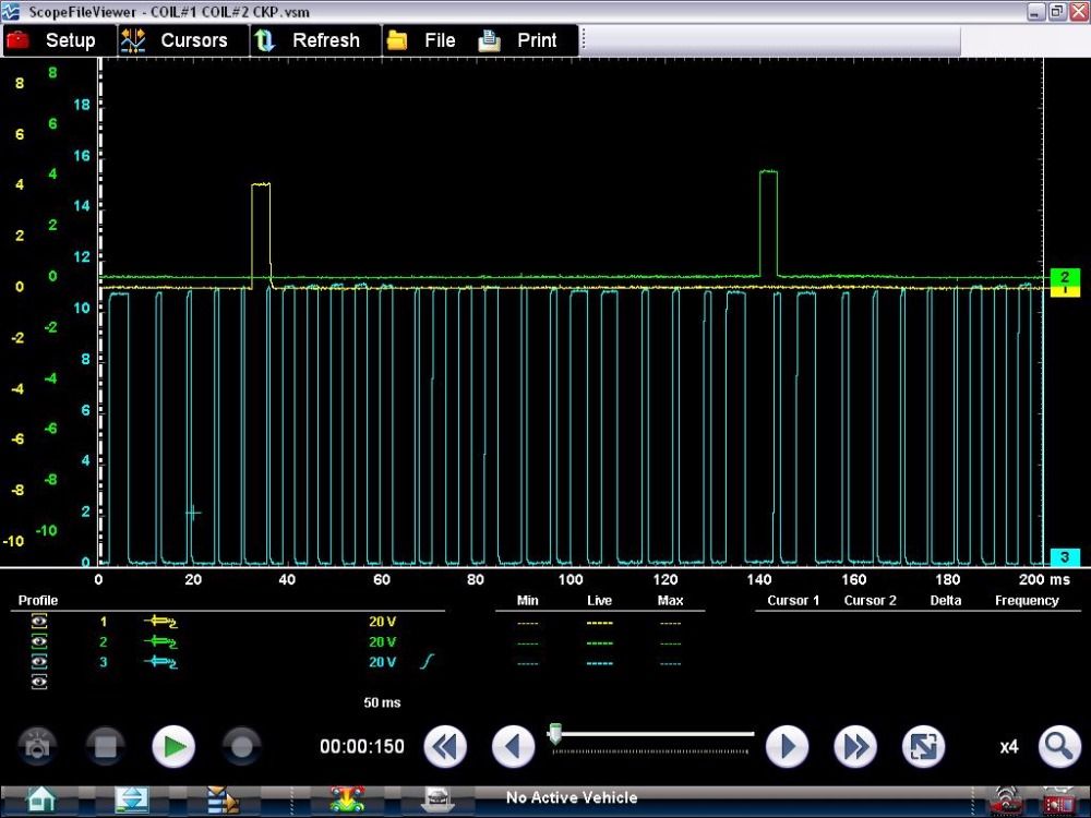 Here is a capture of a CKP( BLUE) COIL#1 (YEL) COIL #2 (GREEN). I connected the ground at the battery. And to be honest i can't remember where i connected the ground when i test the COIL#5..