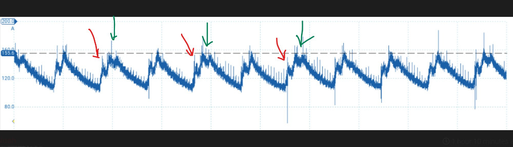 Your waveform, however, has an EXTRA hump (marked in RED) that I am not use to seeing. It seems to be every other cylinder, suggesting a bank-to-bank issue.