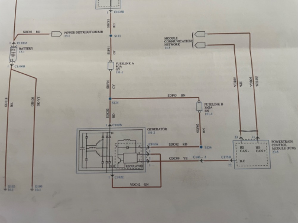 I have a 2006 4.0L Explorer limited. Charging problem is after 5-10min run time not drive time it stops charging. Not just controlled charging but just battery voltage and zero amp output at alt. At that point load test battery and zero amp at battery. Light on dash and code P0620 and that’s it. My system has at voltage regulator 3 wires. One red one green and one yellow. When it does charge all test are normal except yellow PCM wire duty cycle goes to 95-100%. When first start of the day test duty cycle starts normal koeo 0% warm engine 32% and all is well voltage and amperage. I’m at the pulling the PCM trigger but wondering did I miss something. All wires have good voltage drop and resistance test. Battery good truck has 180k runs great we are in the rust belt so I need 4x4. Also if I ground the screw on back of alternator at regulator it charges full voltage 15+. Diagram is my system