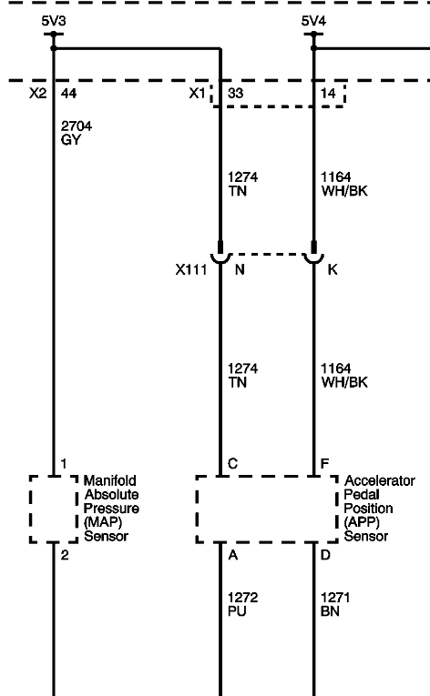 I have same the codes. I am back probed into x111 pin N for 5v ref 3 to APP (according to OE reference diagram and powertrain management) and 5v ref 3 right into MAP sensor. From X1 of ECM, pin 33 is a tan wire, remains tan through x111 then into APP. Connector view shows Pin N on X111 to be a 5v ref 1?