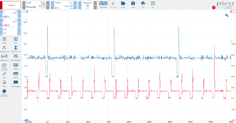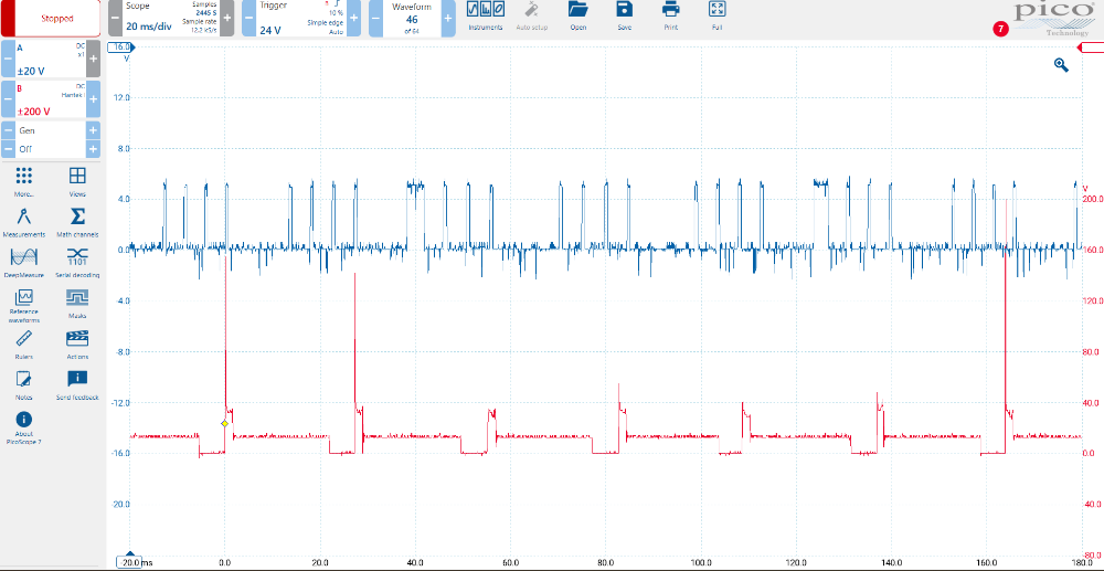 coil control signal at ECM with #1 injector driver at ECM; - coil spark lines do not all rise up or are inconsistent in height