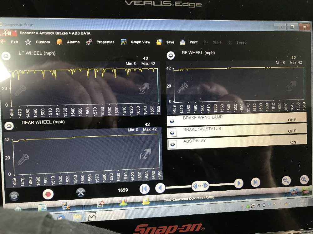 07 Chevy Colorado getting a left front wheel sensor error don't remember the code replaced front hubs left and right front sensors left and right making sure left sensor went to left side and right sensor went to right side I included two attachments screenshot I have no wiring diagrams 07 Chevy Colorado 2.9 L two-wheel drive standard suspension I did use my lab scope had good signals where I back probed at the wheel speed sensor connected to the chassis electrical harness