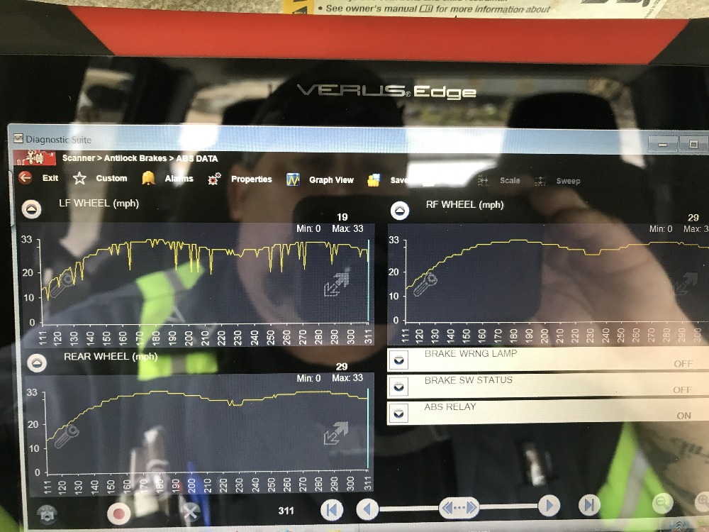 If you have the opportunity to scope the front wheel speed sensors again, you might try using the Frequency mode in the Graphing Multimeter on the Verus. This might show a glitch in the signal, compared to looking at the raw signal on the Lab Scope. A frequency glitch might be down to a defective tone wheel on your replacement hub.