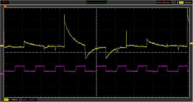Channel 1 (yellow) looks like the channel is set to AC input --- not possible on the Hantek 1008 but there is an AC software setting on other Hantek scopes.