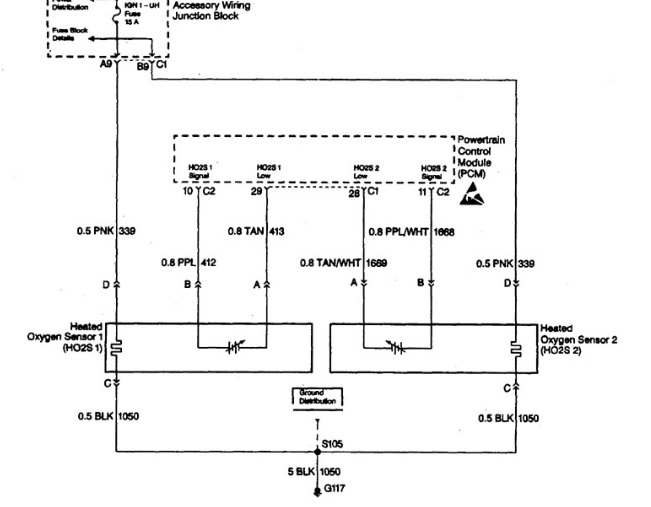 After the car has sat overnight, turn the key on (don't start it), and watch both O2 signals. Both should start dropping lean after a minute or so. If one refuses to start dropping low, that's a sure sign of a dead heater. Here's an example of what you should see off a '99 Pontiac: