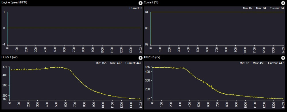 The upstream o2 sensor shows the typical up and down on the graph in the modis edge while the downstream moves from a gradual high to low then back up it seems.
