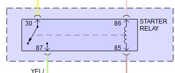 Yes. Anti-theft. This would prevent the PCM from grounding #85...Pin #86 should still get power with the key in the start position, but without the ground on #85, no electromagnetic field. Relay #30 - #87 gate will not close. No power to the solenoid. But you should STILL get battery voltage on #30, all the time, and on #86 with the key in the start position.