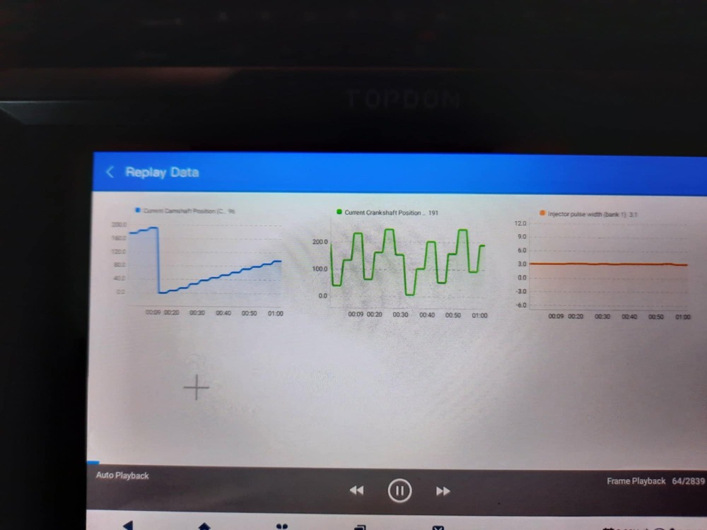 I'm just speculating here but i think it's because the camshaft turns 2x slower in relation to crankshaft and when the counter reaches a limit (200 or 255 not sure), it restarts at zero. The current camshaft position probably looks smoother because it turns the slowest, while the current crankshaft position "waveform" looks jagged because the computer couldn't spit out enough points to to make the graph look smooth as your scanner connected the dots to make that graph. Perhaps if you graphed the current crankshaft position pid solely the picture would improve.