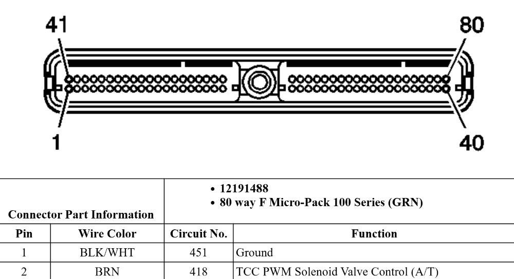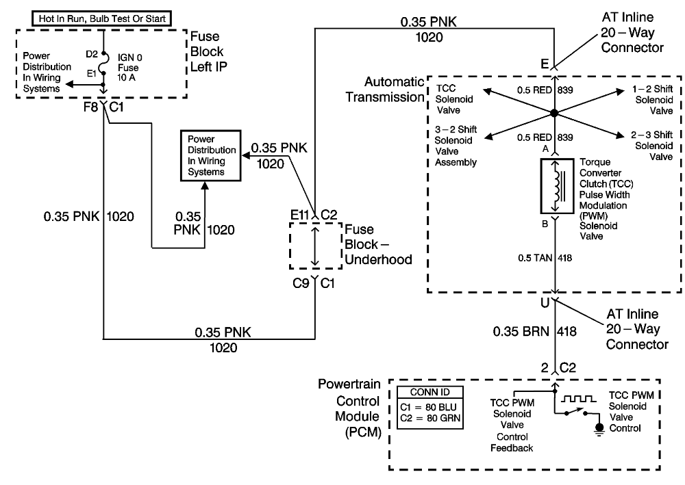 At this point I have to question the harness. Circuit #418 for the TCC PWM control goes from pin U at the transmission to pin #2 of connector 2. It sucks, but it may be time to ohm between pin U and pin #2 of C2. We want to make sure that circuit #418 is going to the correct pin at the PCM.