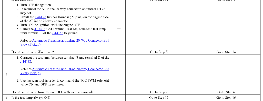 Service info specifies 10-15 ohms for the TCC PWM solenoid, so I'd call that good.4. With the connector still disconected I did an OHM test beteen the two pins E and U on the transmission side to check the OHMS of the solenoid which read 10.2 OHMS