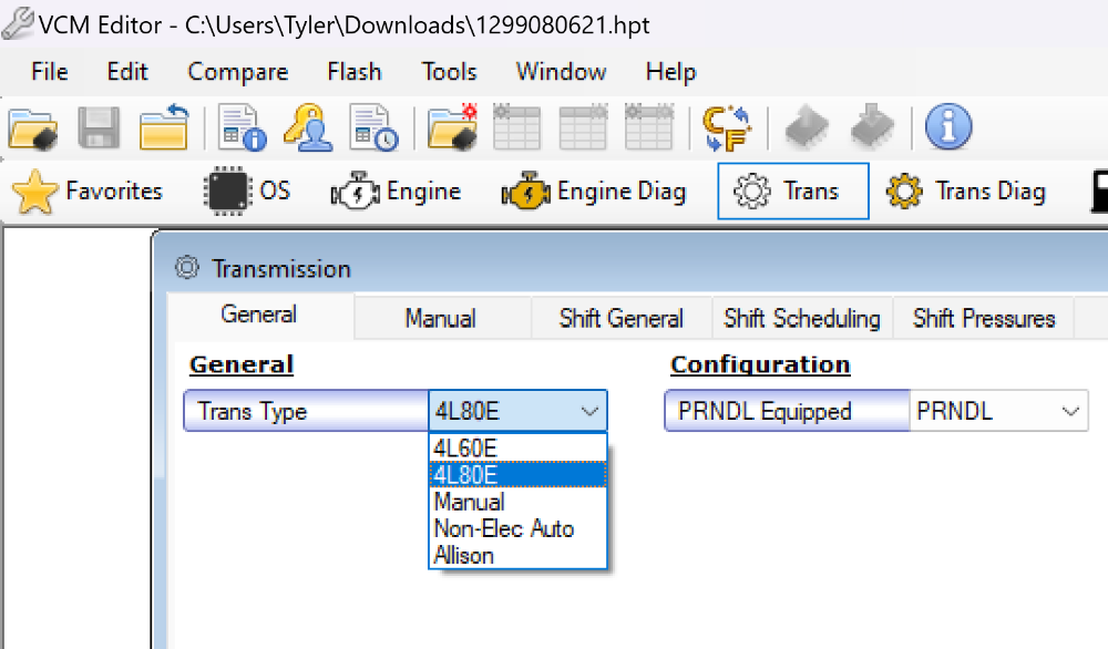 Thinking along those lines, I downloaded a 2000 Silverado 6.0L stock file from the HPTuners Tune Repository, just to have something to work with. I found the 'Trans Type' option under Trans -> General:Good point on the PCM programming, I was also starting to look that way and do a deeper look into both the PCM and the transmission.