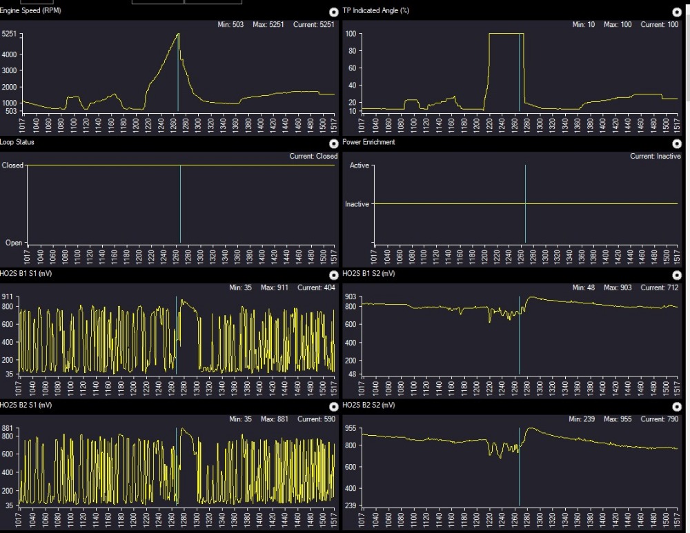 One anomaly I do see with the vehicle fully warm. The down stream O2 sensors are indicating lean at about .100mv. I would expect to see .700mv. I’m hitting the number on the MAF. Have not verified fuel pressure yet but fuel trims are not indicating a fuel delivery problem. No DTCs. Can you help?