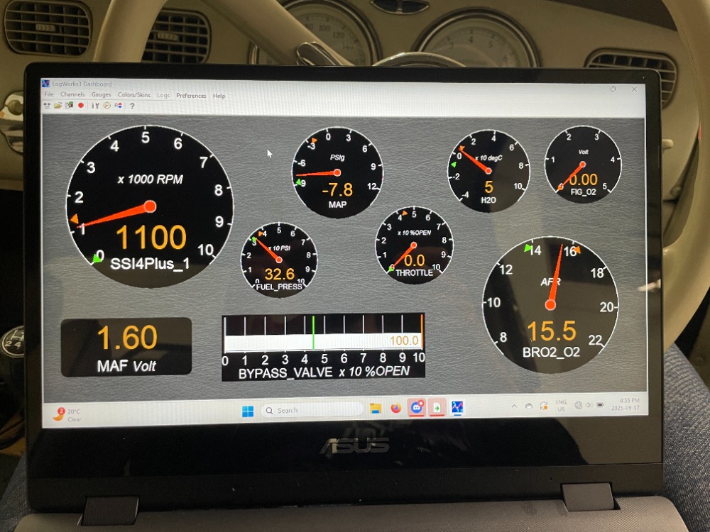 I'm working on a Nissan Figaro that I did an engine swap on. I've been working steadily on this for the last 7 or 8 years. The car is a Nissan Figaro built on the Nissan K10 platform which was only available in mostly in Japan, Canada and Europe. The engine is out of the JDM only March Super Turbo with the MA09ERT engine. The engine is both Supercharged and Turbocharged from the factory. As the car does not have any useful diagnostic port, I had to build my own breakout box to intercept the signals from the sensors to the ECU. The car uses the RPM and MAF signals to deliver fuel. I've added my own MAP sensor and Fuel sensor to read the pressures in both of those systems. I've also added a sensor to read the supercharger bypass valve to ensure that it's opening. I'm using two Innovate SSI4 and their LC2 controller to log the data. The SSI4 allows for 12 hz for data acquisition. Here are the signals I am currently monitoring.