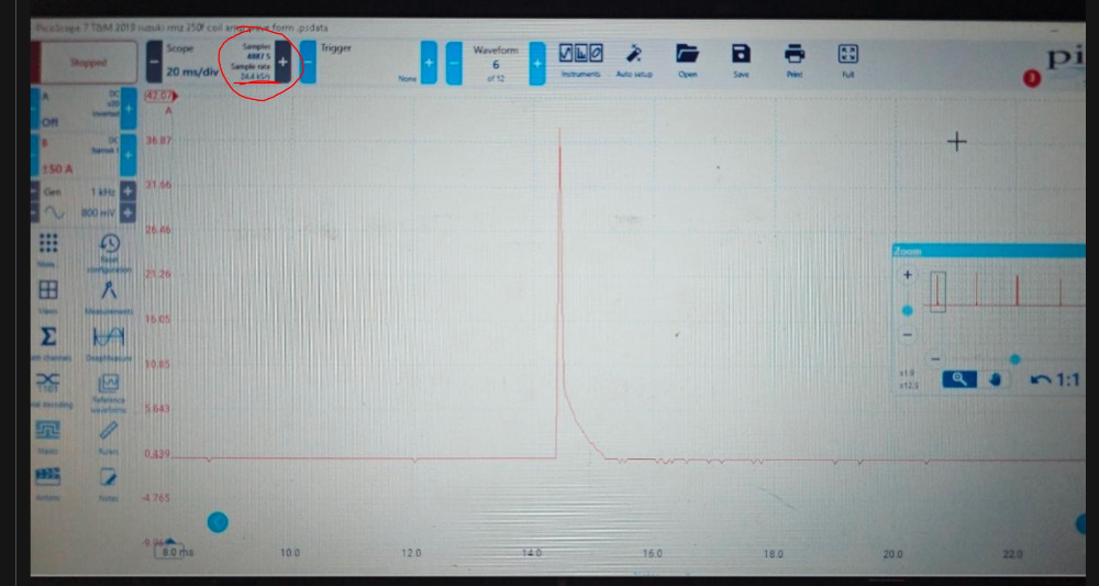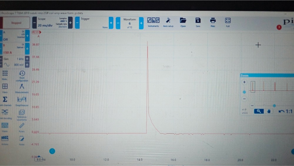 motorcycle runs and drives perfectly, no complaints at all, i was playing with my picoscope and I tried to see the ignition coil amp waveform, this is the first time I see a waveform like that