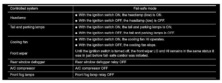 But when i turn on the ignition to on or start the engine, the cooling fans are ON HIGH, the headlight comes ON LOW, the front wiper cannot be operated, but the rear wiper can be operated, the license light and brake lights are always ON, the rear defogger is always OFF, the compressor doesn't engage, and the panic alarm doesn't blast out of the horns.