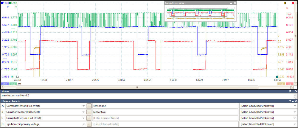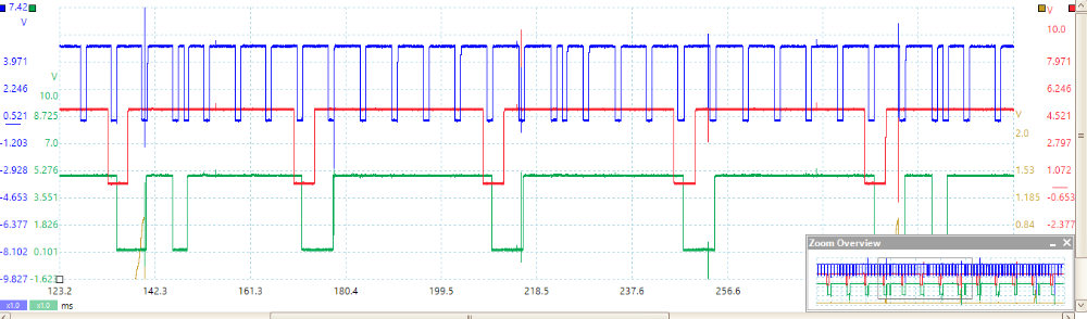 From what I can tell, two things happened around '08. One, the CKP reluctor changed, from 12+1 in the known good I posted, to yours with too many teeth for me to count right now. :silly: Two, the exhaust CMP reluctor changed, from the 4+1 in mine, to one that looks like the trace in blue: