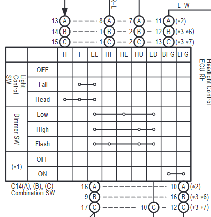 Thanks! I didn't see any reference to an ecu in the wiring diagrams for my model but it's definitely the same acronyms. Plus I know this model had a theft control ecu which can affect headlights at least on versions fitted with automatic lighting. I didn't think it affected non-automatic lighting versions.