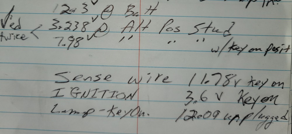 Looking at the fuse when working on this something told me something wasn't right. Also we had readings that basically told us what we've always been led to know that's apparently the fuse was good because we were getting voltage readings. Knowing what I know now instead of wrapping a couple hours into this I should have pulled the alternator fuse and checked resistance. It was a big lesson learn because when I pulled the alternator fuse and check resistance we had all types of resistance. Checked it against a new alternator fuse in the package by piercing a small pin hole through each side and use them back probe connectors to check and make sure I was getting a different reading off the fuse in the package before I opened it. The old alternator fuse had it where you had to actually remove the screws. The new alternator fuse you can push down in with the screws loose and then tighten down the screws on each side were they bolt in. I will try to dig up a picture of the fuse because looking at it afterwards it makes sense even though I had a voltage reading.