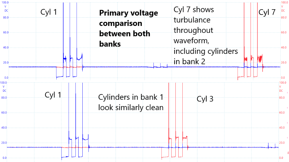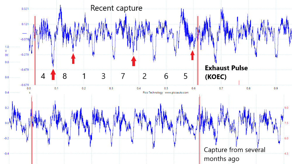 So, I managed to scope the intake with the piezo sensor. I didn't have a hose large enough for the crankcase test, so I'll try it this weekend. Something that I didn't mention was that this vehicle was brought to me several months ago. I couldn't find the issue, so the owner said it was ok since the vehicle was hardly driven, and that he was going to worry about it later. He began driving it recently, and the misfire issue has been getting intermittently worse, which is why it's back in my hands, once again. While looking through my pico files, I was pleasantly surprised to find saved intake and exhaust pulse waveforms from that vehicle. I forgot that I had saved them several months ago. Well, this time around, the intake and exhaust pulse waveforms looked very different from the original waveforms. Initially, they looked good but gradually got worse. Intake looks ok at idle, but falls apart when a clear-flood crank is performed (same with the exhaust side). I also probed primary side of the ignition coil #1 and compared it to the cylinders in bank 2. I noticed quite a bit of turbulence in the spark firing lines in bank 2, especially on cylinder 7 (the cylinder that has the highest misfire counts of all). This is a mechanical problem, but I'm seeing faults in both the intake and exhaust waveforms. Both banks seem to have faults? It's hard to say exactly what the fault is, since this is the first time I've ever caught a fault with the piezo sensor. I think it's time to build an in-cylinder pressure transducer and see what interesting waveforms I can capture.