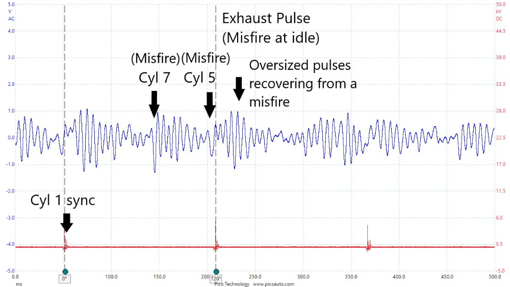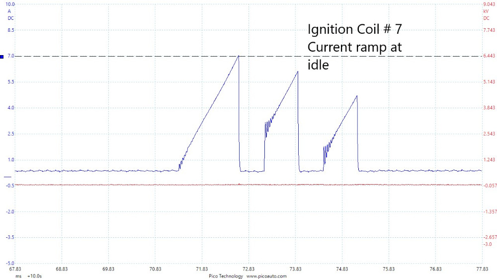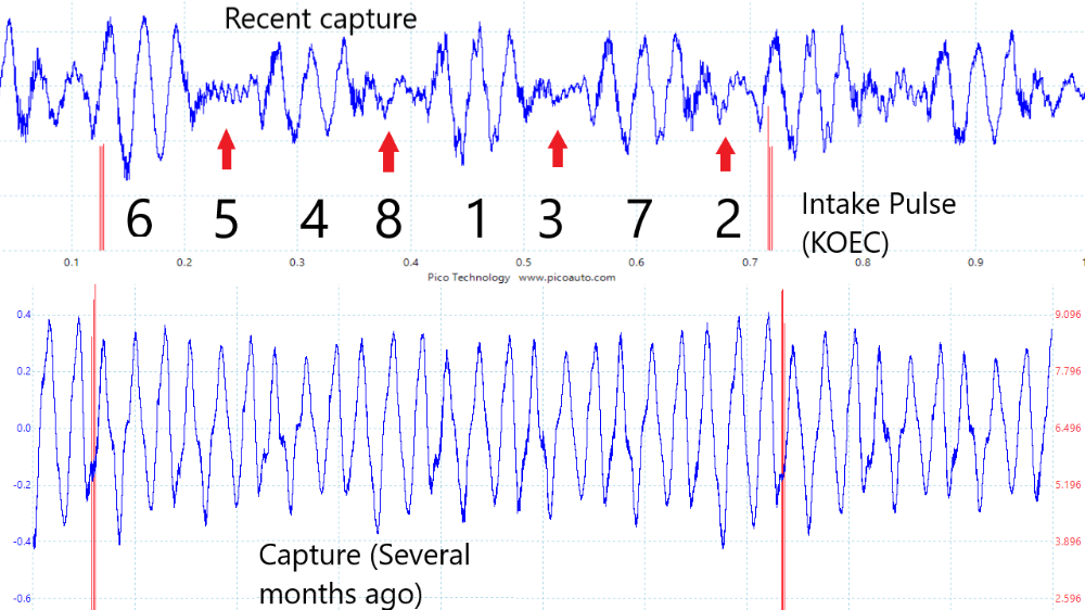 Fuel trims remain under 6%, so I don’t feel that it’s a fuel delivery issue. In fact, fuel trims on both banks are identical. I did notice slightly elevated fuel trims under load, so I cleaned the MAF sensor just for good measure. O2 sensors on both banks are working properly and voltage readings are also identical. There are no codes in memory, but I did catch the MIL flash once while test-driving it. I had a scan tool connected and a pending P0302 was stored. After the test-drive, the pending code cleared on its own. Mode 06 showed some misfire counts on Cyl 2 and Cyl 7. This vehicle has a vacuum-operated EGR system. Concerned about EGR gases possibly passing through at idle, I checked the EGR vacuum solenoid operation with a vacuum gauge and bidirectional control. It’s sealing at idle. Also disconnected the EGR tube that connects directly to the EGR valve, to verify if EGR valve wasn’t sticking slightly open at idle. Nothing wrong with the EGR system, Although I have access to advanced diag tools, I lack experience. I worked at a shop for a couple of months and did some diag work, but this one is kicking my butt. Data is pointing me towards a mechanical issue, but relative compression looks good. I don’t have enough data to call it a mechanical issue. I don’t have an in-cylinder pressure transducer either, so I went ahead and ordered a compression test kit. The multiple misfires were sidetracking me, but I think I need to zero in on this cylinder 7. I’m trying to gather as much data as possible. Anyone with experience with these 5.4 engines will be greatly appreciated. I've attached some waveform captures and videos.