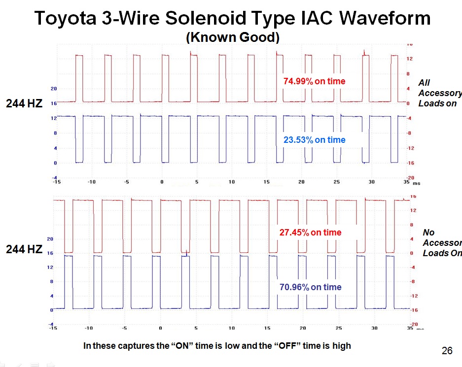 Vehicle is a UK spec '99 Toyota Rav4. Vehicle is running lean and during the process of elimination I checked the 3 wire idle air control valve and found that the ISCO (open) valve (yellow/black) wire was giving a signal on my scope and the duty cycle was at 40%. However, checking the ISCC (closed) valve (blue/black) gave no scope signal whatsoever. Rechecked connection, all good but still no signal. The idle air control is ground side switched with power coming from a relay.