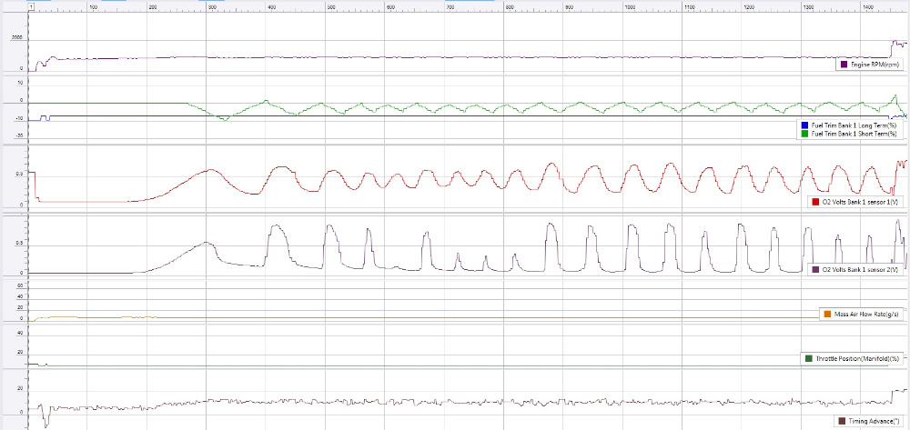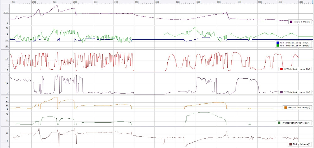 That solved the deceleration issue, but now it stumbles and runs badly up to 2000 rpm or so, then it smooths out and accelerates fine beyond that. It did have a high idle for a while, but that eventually settled down and the engine idles pretty well now. It doesn't set any error codes. I set up data logging on the Torque app, and made a graph, but I don't know what I should be looking for on it.