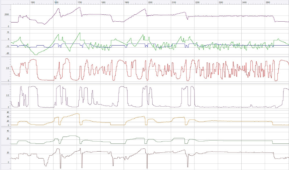 Graph 2 is pulling out of the driveway, then accelerating in 1st, 2nd, and 3rd gear, then slowing for a turn around frame 1850, then acceleration in 2nd, 3rd, and 4th. Frames 2200 through 2500 are steady speed (rough running the entire time), then slowing for a stop.