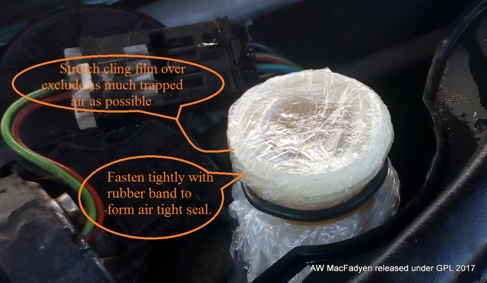 The other method to stem fluid loss is the Cling Film method which is simply filling the fluid resevoir up until it is on the point of overflowing and stretching cling flim across the top excluding any air . Then securing it with a rubber band or two round the neck to form an air tight seal. If the resevoir cap is a plain cap without a level switch then screwing the cap on tight over the cling also works.