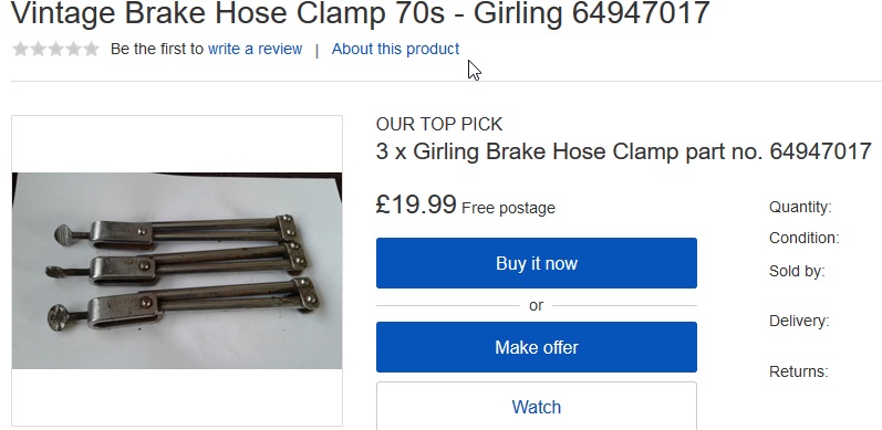 Here is the original 1960's style of Girling brake hose clamp on eBay --- Laser Tools make an almost identical tool today, very gentle on the hose but the size makes it a bit awkward to use.