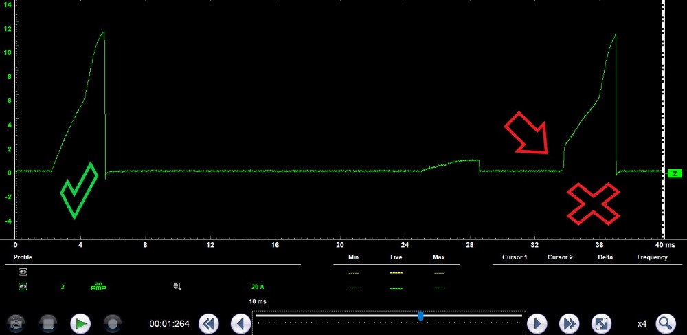 Also know that some coils just don't generate a visible coil turn-on oscillation, or the oscillation may be very difficult to view depending on your scope. A missing turn-on oscillation is not necessarily a red flag.