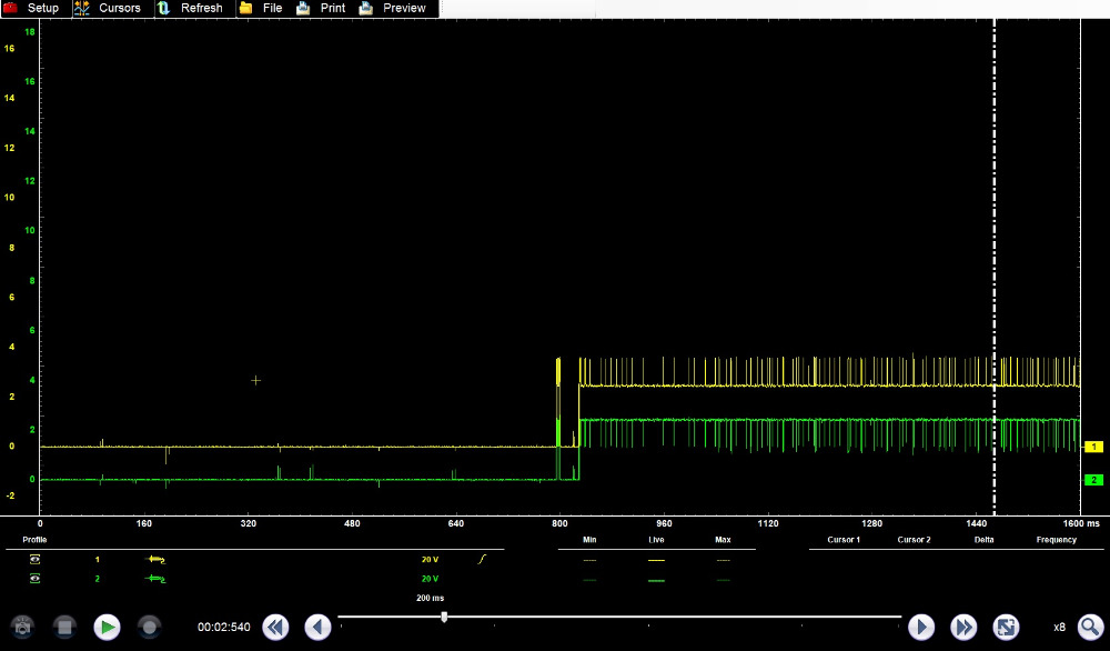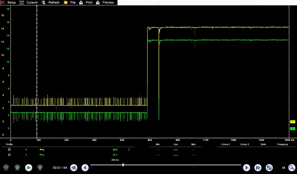 First up, using an incandescent test light at the DLC. This test supposes that you're poking at the connector, looking for power/ground, and touch one of the CAN pins on accident. Will the network survive? :ohmy: These captures were taken at the DLC, with yellow showing CAN+ and green showing CAN-.