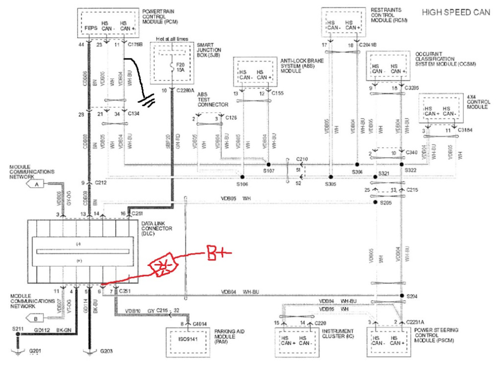About half brightness. :huh: If I'm thinking about this right, then the only way this could happen is if current went through the CAN- wiring, through the PCM node, and found the short to ground on the CAN+ wire. :ohmy: That bulb draws 150mA at full brightness, so we can figure 75-100mA is going through that node.